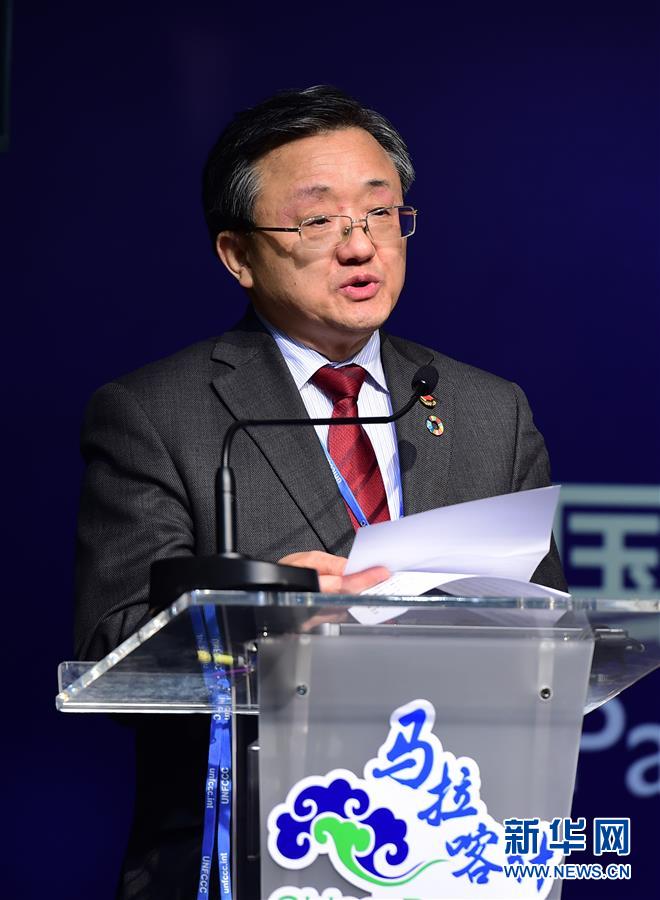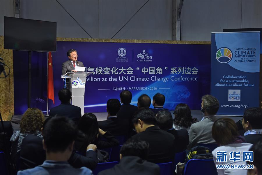 11月14日,在摩洛哥马拉喀什举行的联合国气候大会上,中国代表团副团长、外交部副部长刘振民在“中国角”系列边会中的“应对气候变化南南合作高级别论坛”上讲话。刘振民说,气候合作是中国开展南南合作的优先和重点领域。中国在敦促发达国家履行国际义务的同时,将积极支持其他发展中国家应对气候变化。新华社记者 赵丁喆 摄
