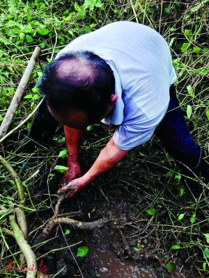 冒雨在杂草中走了两个小时,吴岐黄却毫不喘气,依旧趴在草丛中,挑选草药。有些根系埋藏较深的,他就用小铲子将根部的泥土挖松,慢慢掘出来。中午12时,在一处十几米高的岩壁上,吴岐黄像猿猴一般攀了上去,惊呼“快看”,语调中满是惊喜。这是一种高约10厘米的小草,星星点点的浅紫碎花顺茎盘旋而上,像一条小龙。“这种草叫盘龙参,只在清明前后才有,一天下来找不到两三株。比冬虫草还珍贵,一两能卖几百元。可以治疗痛风、糖尿病、高血糖。闻起来像人尿,熬出来的水却很清香。”吴岐黄挥舞着双手,一口气说了一大段。