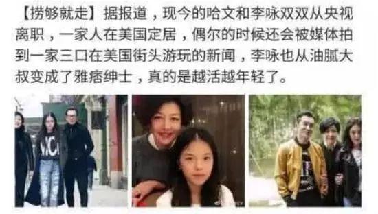 今年8月初,有网友爆料称李咏和哈文一家三口已经定居美国的消息。还称偶尔还会被拍到在美国街头游玩,而李咏从改变发型后也越来越年轻了,对此引发不小的争议。