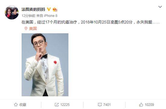【中国经济新闻联播综合】今天,李咏妻子哈文@法图麦的妈妈 发微博:在美国,经过17个月的抗癌治疗,2018年10月25日凌晨5点20分,永失我爱……