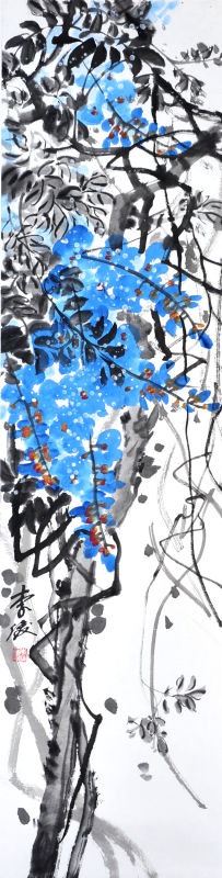 李俊的花鸟画令人眼花缭乱,然让我最喜欢和钦佩的是他的紫藤。紫藤属藤本科植物,几十年,上百年的紫藤,盘根错节,藤茎曲屈,犹如虬龙入海,那种苍劲、古拙、自然翻飞的感觉和姿态,再加上藤上以紫色为主的花,上下翻飞如彩蝶留恋,微风吹拂,香气氤氲,静中寓动。古人画藤明清间不泛其人,而近代最著名的当推吴昌硕、齐白石,他们笔下的紫藤,以篆和草的笔法入画,厚重、金石气息磅礴之外,主要是繁而不乱,气息生动,令人百看不厌。今李俊先生所画的紫藤,得吴、齐二老之神韵,却又多了一些秀润和变化的现代气息,既给人以痛快淋漓、直泻心臆的爽直感,又有一种苍老古朴的历史美感。另外,与众不同的是李俊师承徐培晨,徐老以画写意猕猴而名扬大江南北,故李俊的紫藤上常会有灵猴出现,猴的敏锐动作姿态与徐老一脉相承,而与他的紫藤相配,在笔法、水墨、色彩以及署款、印章等相配,可以说是一气呵成,彼此相得益彰。从中也可看出了李俊所下的功夫,广收博取,食古不化,变成了他自己的艺术,令我钦佩。李俊也作山水,多以水墨为之,少有蝦青、赭石,但多是江南景色和园林风光,细笔勾勒,用心写意,笔墨中透出了他对家乡山水的无限留恋和热爱。