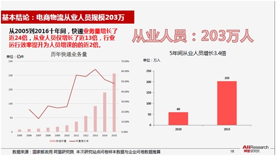根据从业者报告的数据,截至2016年初,全国社会化电商物流从业人员达到203.3万人。此前《快递服务“十二五”规划》显示,截至2010年快递从业人员达到60万以上,5年间从业人员上涨约3.4倍。