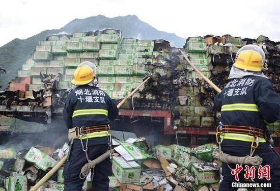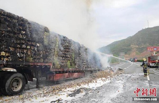 5月18日上午7时许,一辆载有30吨梨子的货车在行至福银高速十漫段郧西县上津镇收费站附近时突然起火。当地消防紧急灭火,但因包装梨子的纸箱助燃了火势,30吨梨子全部烧毁,货车也基本报废。火灾未造成人员伤亡。范时瑞 摄