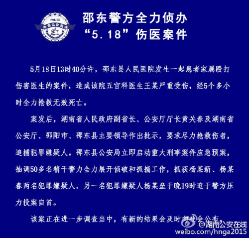 据湖南省公安厅微博消息,5月18日下午,邵东县人民医院发生一起患者家属殴打伤害医生的案件,造成该院五官科医生王某严重受伤,经5个多小时全力抢救无效死亡。