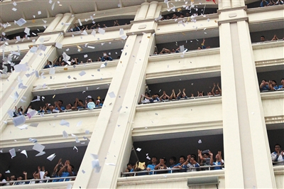 20日,厦门市海沧实验中学,学生在教学楼前将废旧试卷和书页撒下,缓解高考压力。