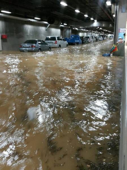 二航厦的报到柜台也淹水,机场D侧一度停电10分钟左右,地下室、停车场也成了水乡泽国。受到暴雨袭击,桃园机场陆空交通大乱,地勤作业除一度暂停,国道进桃机地下道积水,许多机场上班人员,没法准时上班,二航厦断电及漏水,地下室也淹水,机场人员积极抢修中。