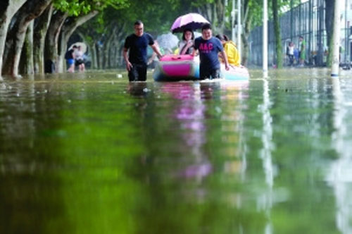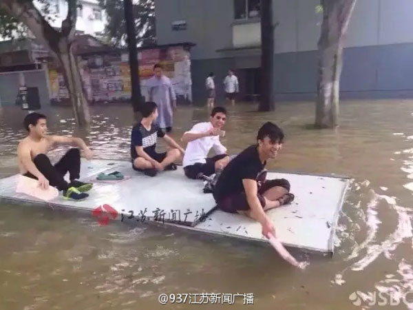 南京持续暴雨,南京理工大学校园被淹,学校后勤调来橡皮艇,护送师生出行。
