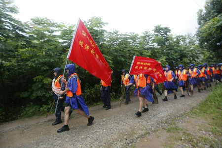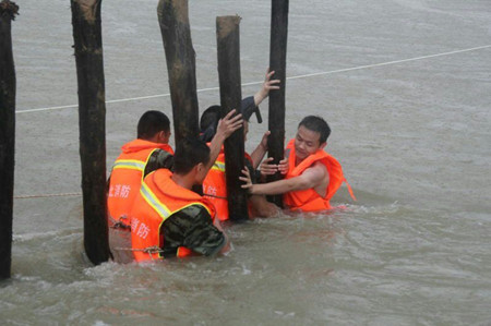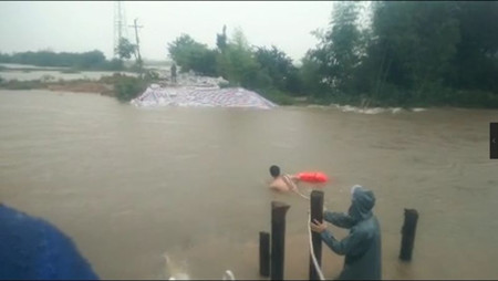 现场指挥部迅速确定了方案并进行了分工,将消防官兵兵分两路,向合围口一线宣战,一组与当地抗洪抢险指挥部一起装木料,打桩筑堤,另一组奋力用尼龙袋装碎石加固缺口。但由于泄洪口水流湍急,且河床较硬加之天气恶劣影响,打桩难度非常大,打好的木桩一次又一次被激流的洪水冲走。随后,现场指挥部决定由水性较好的战士罗新平在做好安全措施的基础上,带上绳索渡过分洪口,到达分洪口对岸将绳索固定,利用固定的绳索将木桩固定住,让木桩更牢固。