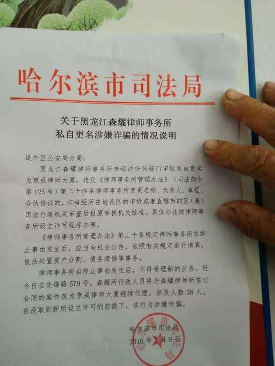 7月9日,哈尔滨市司法局向哈尔滨市到道外区公安分局发出书面材料,指出黑龙江森耀律师事务所涉嫌诈骗。