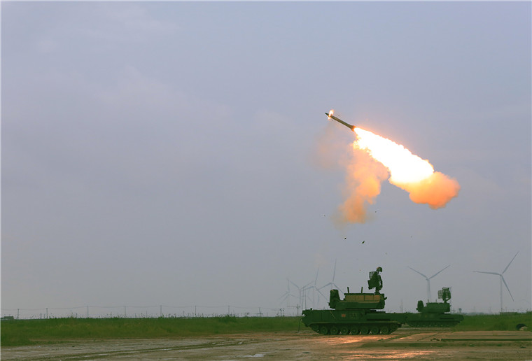 6月21日,东部战区陆军某防空旅在黄海之滨组织实战化防空对抗演练,在复杂电磁环境中检验某型导弹短距开机、极远射击等课目训练,有效提高部队对空抗击能力。图为中国红旗17/道尔M1导弹实弹射击瞬间。