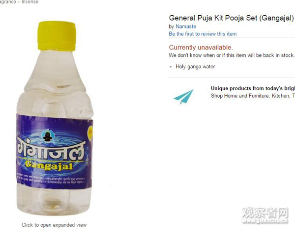 在亚马逊和Snapdeal等电商网站上,恒河水标价……印度媒体说挺便宜,看着这黄黄的一瓶……我不想评价。