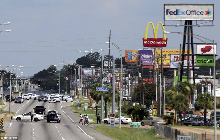 消息人士称,巴吞鲁日警方先是接到报警电话称,机场高速上出现持突击步枪的可疑男子。当警察抵达现场,该男子朝警察开火。图为警察赶往事发现场。