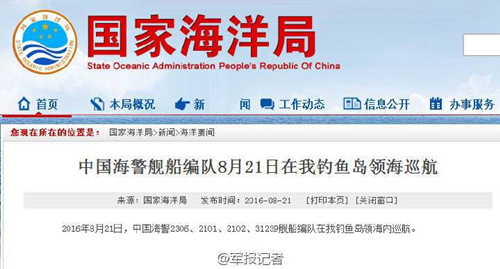 国家海洋局表示,2016年8月21日,中国海警2306、2101、2102、31239舰船编队在中国钓鱼岛领海内巡航。2016年8月17日,中国海警2306、2101、2102、31239舰船编队在中国钓鱼岛领海内巡航。2016年8月7日,中国海警2166、33115舰船编队在中国钓鱼岛领海内巡航。