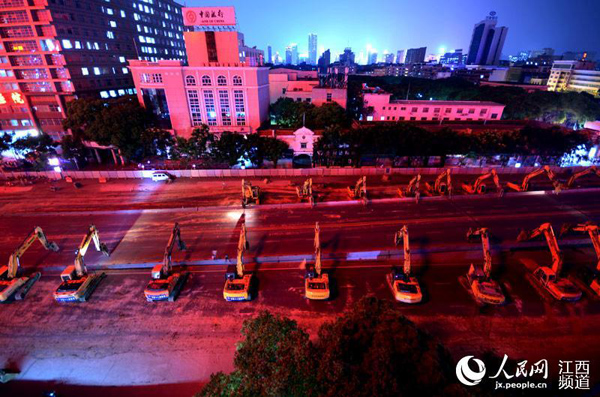 26日晚8时许,86台挖掘机陆续进入永和门立交桥桥底。在立交桥的东、西两侧分别一字排开,伸出长臂,准备同时进行拆除作业。晚9时许,八一大道叠山路口的交通信号灯熄灭,叠山路东西方向的机动车,被禁止由桥下经过。
