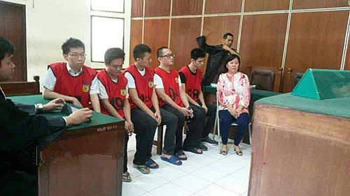 4名台湾人(右2至右5)因持有26公斤冰毒,日前遭雅加达地方法院判处死刑。全案仍可上诉