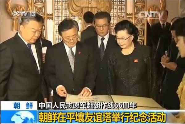 在庄严肃穆的气氛中,在场中朝双方人士向志愿军烈士默哀致敬。朝鲜军乐团现场演奏中朝两国国歌。随后,双方人员共同参谒友谊塔,翻阅中国人民志愿军烈士名录,参观室内以入朝作战、并肩战斗和战后重建为主题的三面壁画。