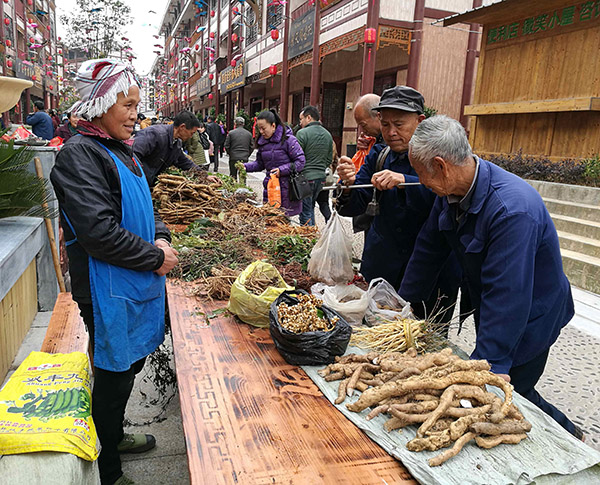 11月27日,顾客在凯里市苗侗医药文化街上采购药材。