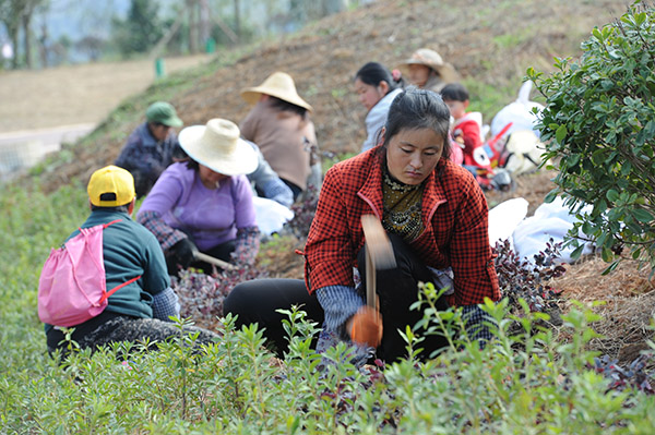 11月28日,在贵阳市乌当区的羊昌镇羊昌村,邓锡芬(前)和几位村民在园区打理花园。