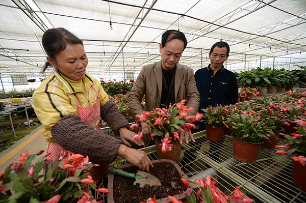 11月28日,在贵阳市乌当区的羊昌镇羊昌村,村民黄朝琴(左一)向一家花卉种植企业的技术员学习蟹爪兰的种植技术。