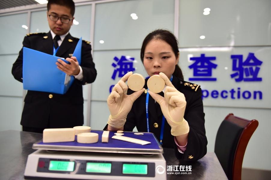 2月21日,义乌海关驻机场办事处工作人员,展示查获的濒危动植物制品走私案中的象牙制品。经鉴定共有象牙制品557克、穿山甲鳞片195克。2月7日晚,义乌海关关员在对一名从刚果经由香港入境的中年男子进行例行查验时,发现其随身行李的X光图像存在异常,检查后发现疑似穿山甲鳞片和象牙制品11件。后经鉴定,查获物品确系穿山甲鳞片和象牙制品。图为2月21日,义乌海关驻机场办事处工作人员正在对查获的濒危动植物制品走私案的穿山甲鳞片称重量登记。 浙江在线通讯员 吕斌 何剑涯 摄 图片来源:浙江在线