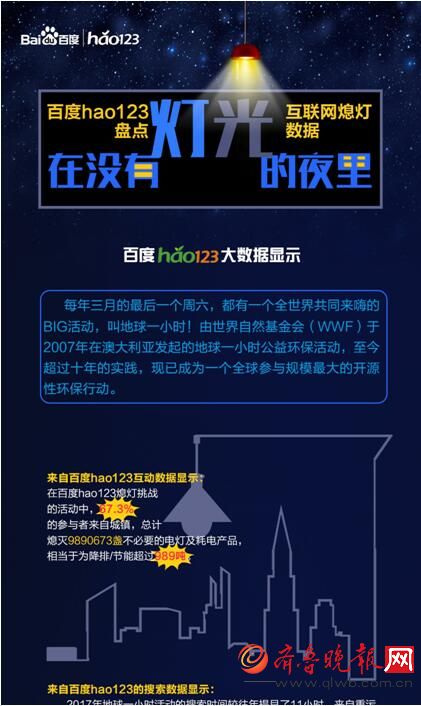 近日,百度hao123推出地球一小时解读盘点,依托于百度hao123搜索大数据和百度hao123熄灯挑战活动的互动数据,将地球一小时的互联网参与数据进行深度还原。诸如“有多少人与我们同行”、“2017地球一小时活动的影响力”等一系列的互联网数据将一一展现在我们眼前,让关注活动和参与其中的你深刻感受到:你的环保行动不孤单!