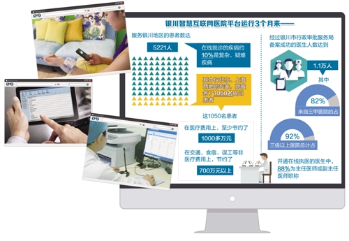 银川智慧互联网医院平台监测的数据显示,平台运行3个月以来服务银川地区的患者数达5221人,其中仅北京、上海两地的专家,就服务了1050名银川患者。在线就诊的疾病约10%是复杂、疑难疾病。