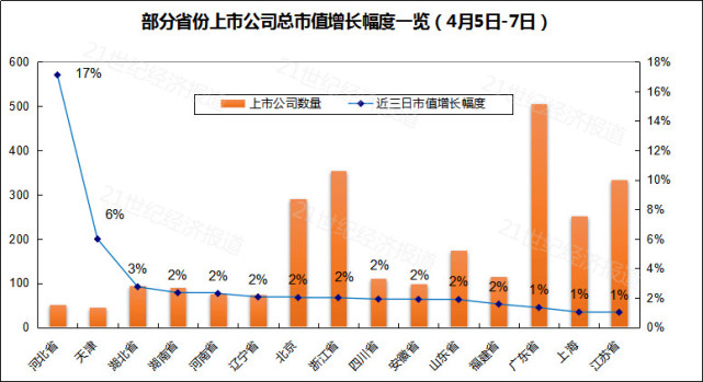 据21数据新闻实验室统计,4月4日-7日期间,河北省的上市公司总市值增长了1433亿元,增长幅度为17%,遥遥领先,甚至远超过广东省、浙江省等其他13个省份,而该13省份的上市公司数量远远超过河北省和天津市(如图所示)。