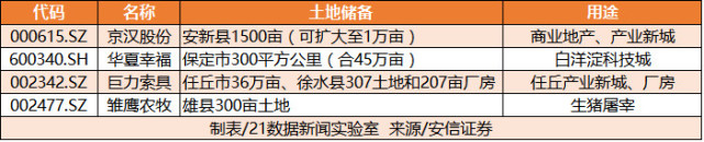 从所属行业看,房地产开发的最多,共5家,其次为水泥制造、综合。值得一提的是,部分上市公司在雄安新区的土地储备情况十分可观,比如:
