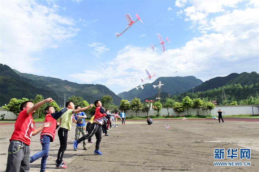 5月11日,在四川省绵竹市清平学校,学生们在了解航模相关知识。