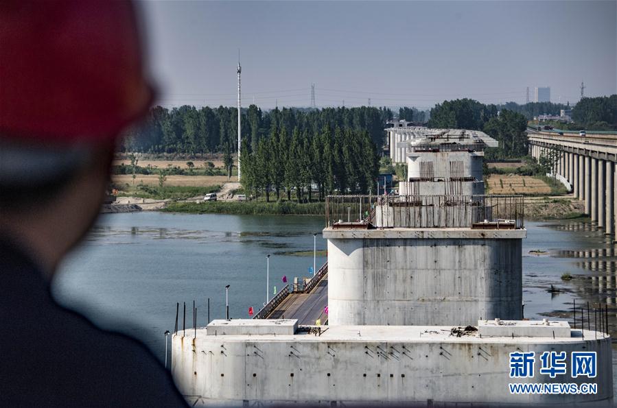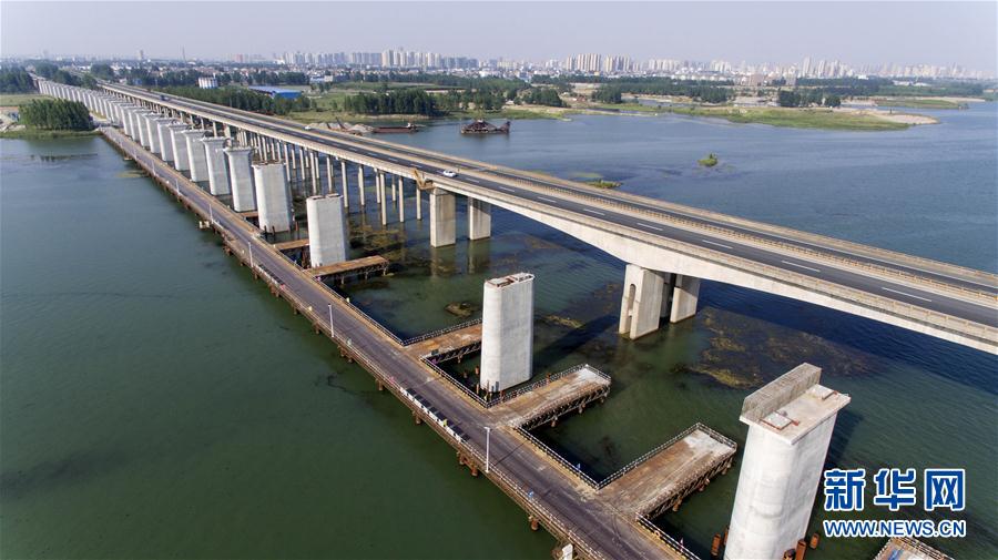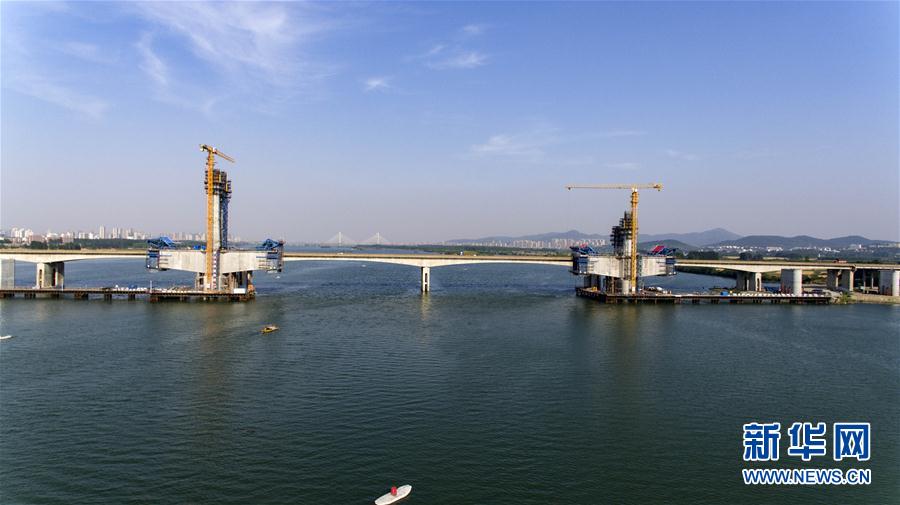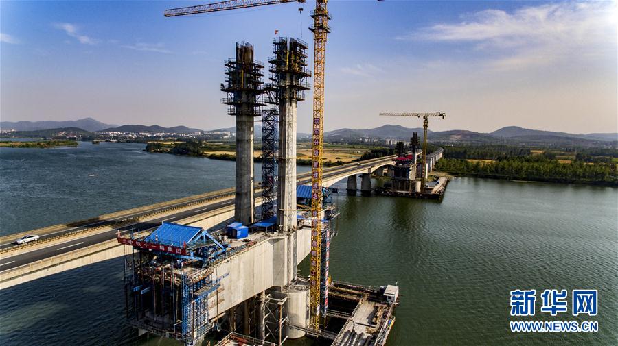 由中铁十一局集团承建的蒙华铁路汉江特大桥主墩和索塔(5月17日摄)。蒙华铁路汉江特大桥位于湖北省襄阳市区上游约3公里的汉江上,总长5242米,是蒙华铁路重点控制性工程之一。该桥江面共18座桥墩,位于江面上的主桥为双塔五跨部分斜拉桥,最大跨径248米。据了解,蒙华铁路汉江特大桥目前建设顺利,施工难度最大的主桥斜拉索索塔将于本月底完成封顶。蒙华铁路全长1800多公里,线路北起内蒙古浩勒报吉站,终点到达江西省吉安,计划2020年建成开通,是继大秦线之后我国又一条新建超长距离的运煤大通道。新华社记者杜华举摄