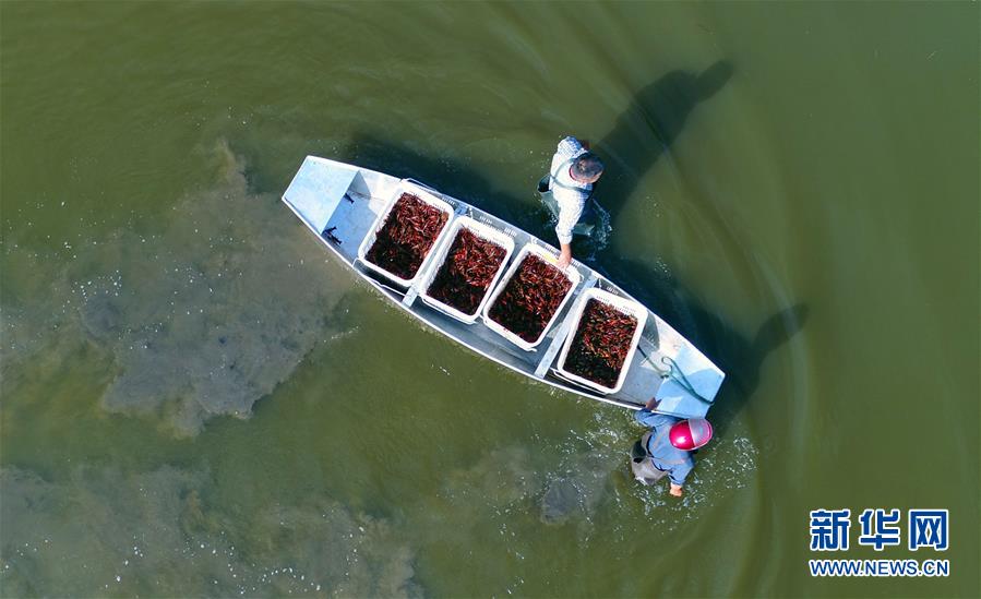 6月7日,两位农民在湖南南县明康龙虾养殖专业合作社的稻田边将收上来的小龙虾装箱。十多天后这片稻田将开始种植水稻,而没被收走的小龙虾将游入稻田边上的水沟里继续繁殖,繁殖出的虾苗第二年将回到水田生长。近日,位于洞庭湖区的湖南南县的稻田里一片繁忙景象,当地农民正赶在种植水稻前抢收稻田里的小龙虾。近年来,南县大力发展稻虾共生立体生态循环种养,在稻田里实现养虾和一季稻轮作。据介绍,稻田养虾不但提高了农田的单位产出,而且可起到除草、节肥、疏松土壤等作用,让水稻种植更加绿色环保。在南县,“稻虾共生”已形成了一条产业链,当地企业加工的速冻虾、虾仁等产品销往全国各地,生态种植后加工而成的“稻虾米”,价格也大大高出普通稻米。目前南县全县实施“稻虾共养”的水田总面积达到25万亩,亩均利润达到3500元,带动了近4万相关人员就业。新华社记者 李尕 摄
