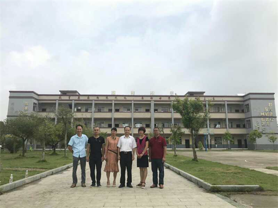 赖业勇(右一)、赖剑(左二)和主编赖衍先(右三)与赖孝烈全资捐建的水岭小学的领导班子校长朱丽萍(右二)、李春清主任(左三)、罗斌主任(左一)合影