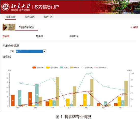 学生数据共享服务平台正式启用,告别了以往重复填表的问题。从校内13个综合业务系统中进行数据采集,完成了28类学生数据的实时集成,准确鲜活,有生命力。在教育改革上,以学校领导关心的转系、转专业情况为例,进入平台点击转系、转专业后,就可以清晰地看到各个学部以及各个院系转入、转出人数等情况(如图1所示)。用大数据思维,呈现教育状况,倒逼教育改革,改进教学质量,促进高校治理。