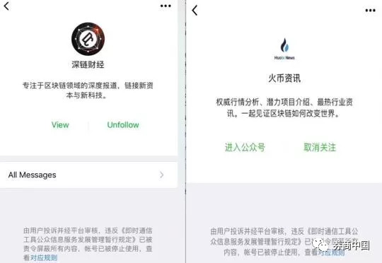以上被封的微信号均为区块链相关的知名公众号,公众号发布的内容涵盖目前链圈业务的各个方面,包括快讯、深度访谈、区块链项目评级,交易平台业务等。