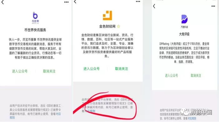 8月21日晚间,一批涉区块链微信大号被封,其中包括深链财经、金色财经、火币资讯、大炮评级、币世界快讯服务、每日币读、TokenClub、吴解区块链等。打开相关微信公众号页面显示:由用户投诉并经平台审核,违反《即时通讯工具公众信息服务发展管理暂行规定》已被责令屏蔽所有内容,账号已停止使用。