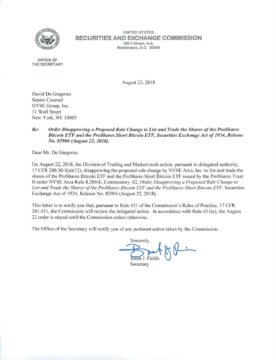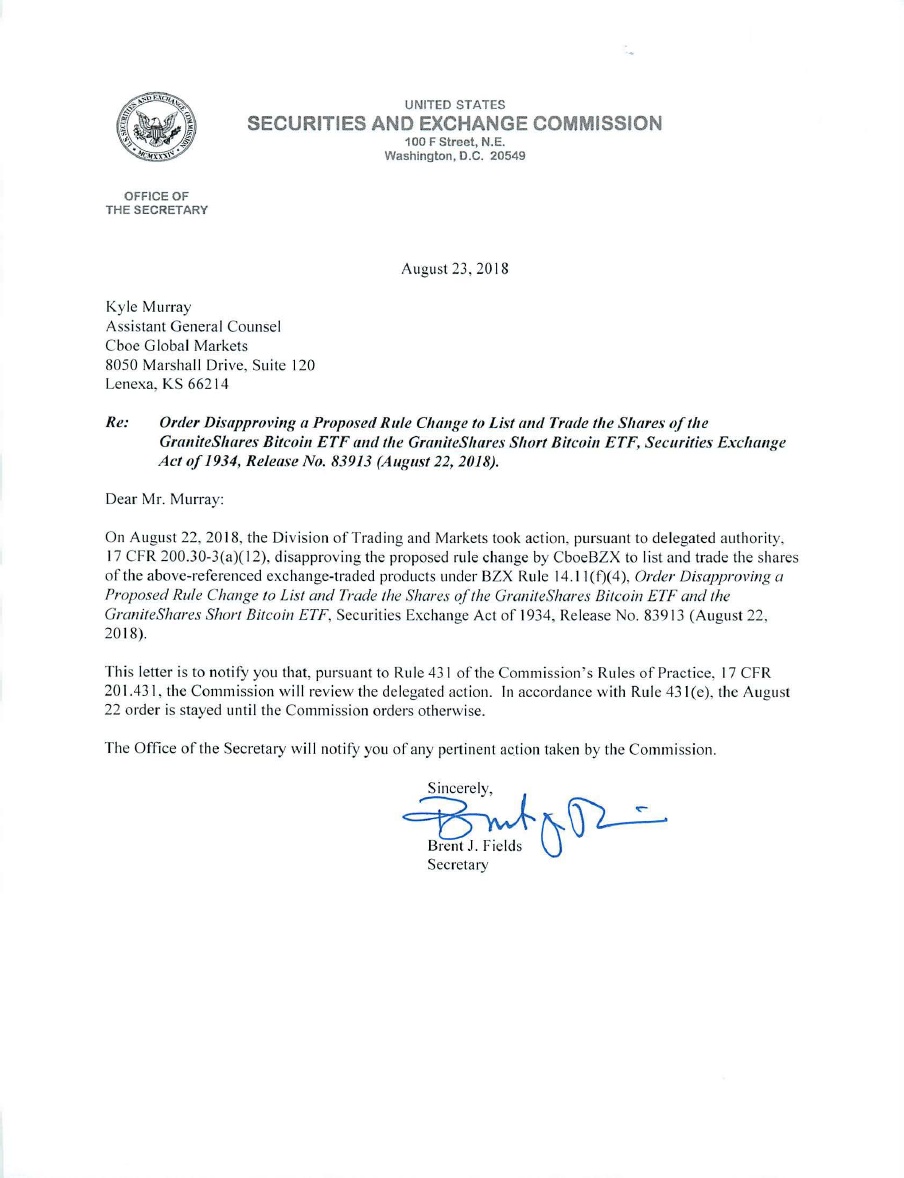 SEC工作人员在昨天晚些时候公布的结果中,拒绝了Proshares, GraniteShares以及Direxion这三家公司的比特币ETF申请。然而,根据最新的信件,SEC高级官员将审查这些命令,目前尚不清楚审查将在何时完成。