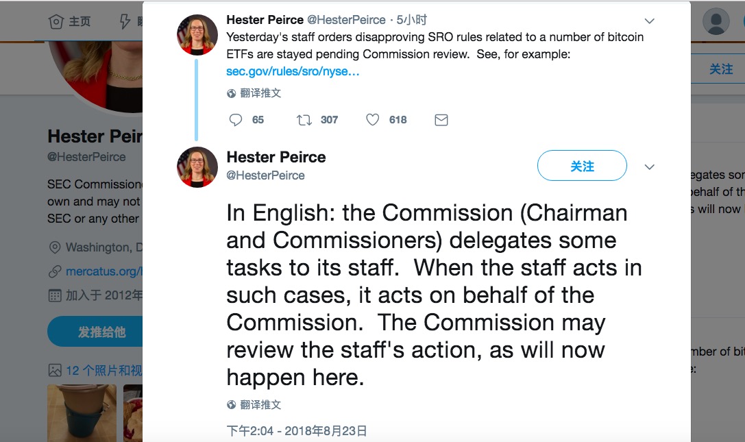 而在后续的推文当中,Peirce委员解释了美国证券交易委员会为何决定重新审查。