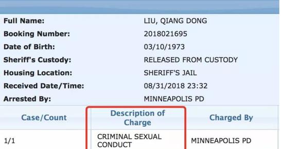 根据美国明尼苏达州hennepin监狱公开信息,8月31日晚23:32,有一名名叫“Liu Qiangdong “的人士因为”criminal sexual conduct”(性侵)在当地被捕,并于9月1日16:05获释,保释金为零。
