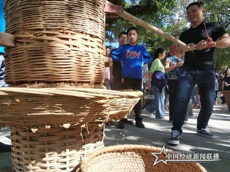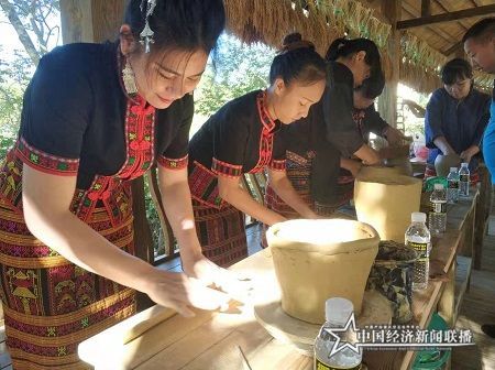 绵延百米的展销长廊,布满了颇具当地黎族特色的“土特产”摊位。山兰酒、三色饭、米糕、蜂蜜、灵芝、山兰米、山野菜、甘蔗、红心橙以及各色果蔬琳琅满目;烧陶、银器、黎锦、舂米、磨米、打米粑,让习惯于现代都市的游客仿佛穿越到了刀耕火种的时空……
