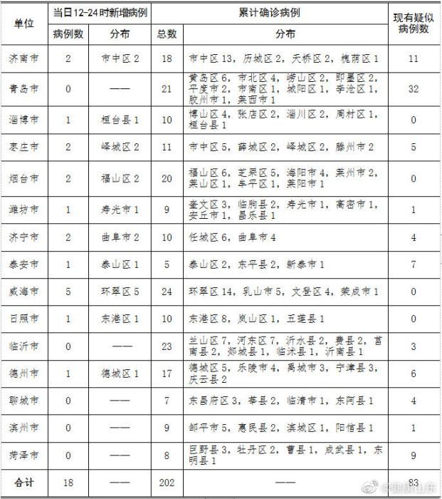 中国经济新闻联播2月1日山东济南电(记者 王海珠)据山东卫健委官方微博消息,2020年1月31日12—24时,山东省报告新型冠状病毒感染的肺炎新增确诊病例18例,现有疑似病例83例,累计确诊病例202例(含重症病例12例,危重症病例1例,出院2例,无死亡病例)。目前,累计追踪到密切接触者6333人,已解除医学观察647人,诊断为疑似或确诊72例,尚有5614人正在接受医学观察。(备注:根据国家卫健委关于疫情信息报告新要求,按病例确诊时医院所在县区统计。)详见下表(单位:例)