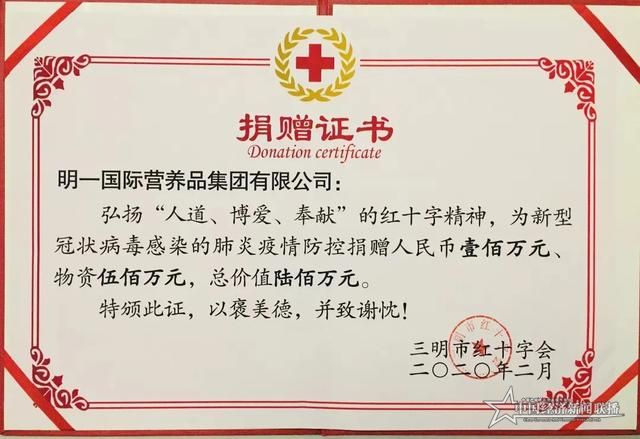 疫情无情,人间有爱。明一国际为支援新型冠状病毒肺炎疫情防控工作,协助打赢这场疫情防控狙击战,向福建省三明市红十字会捐出六百万元的现金和物资,其中一百万元现金用于购买紧缺物资,另外,捐赠价值五百万元的益生菌、奶粉等营养品,让一线的医务人员的安全得到保障,保持良好的身体状态,令这一场肆虐的疫情尽快得到遏制!