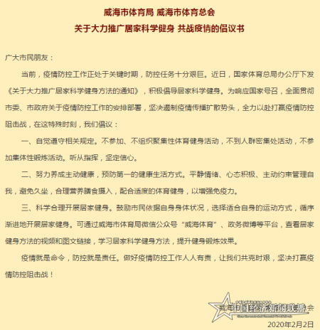 中国经济新闻联播2月7日威海电(记者 冯勋明)在抗击新冠肺炎疫情工作中,面对来势汹汹的新型冠状病毒,威海市体育局、威海市体育总会2020年2月2日发布了,“关于大力推广居家科学健身 共战疫情倡议书”此倡议书公布后在威海市体育健身领域积极发挥了桥梁纽带作用。