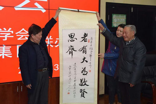 座谈会由贵州省写作学会理事,桐梓县原政协主席黄光荣主持,会上李庆䙗老师向省写作学会赠送他本人编著的《二十世纪风云录》一书。学会为感谢李老师的盛情,也专门向李庆䙗老师赠送书法作品一幅。接着贵州省写作学会副会长、遵义联络处主任黄先荣先生代表贵州省写作学会,隆重的向李庆䙗老师颁发贵州省写作学会会员证
