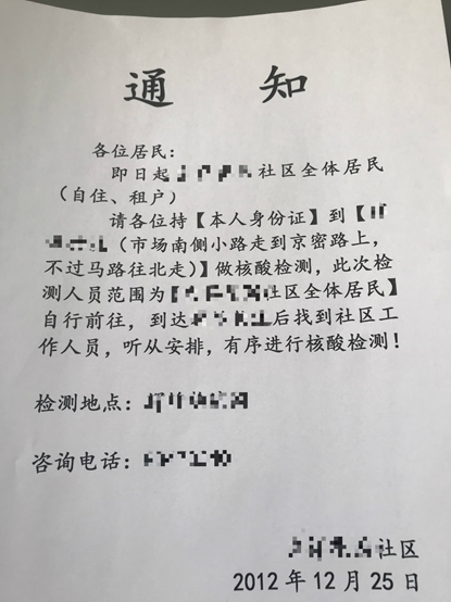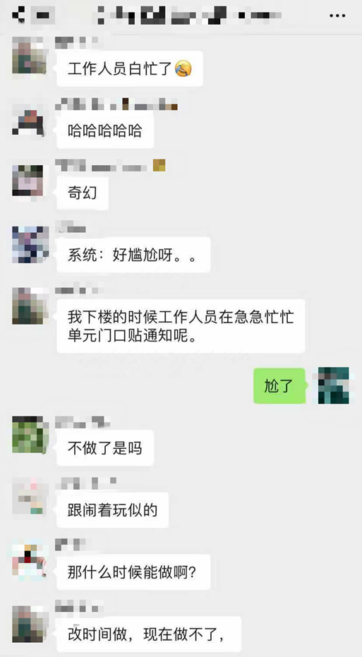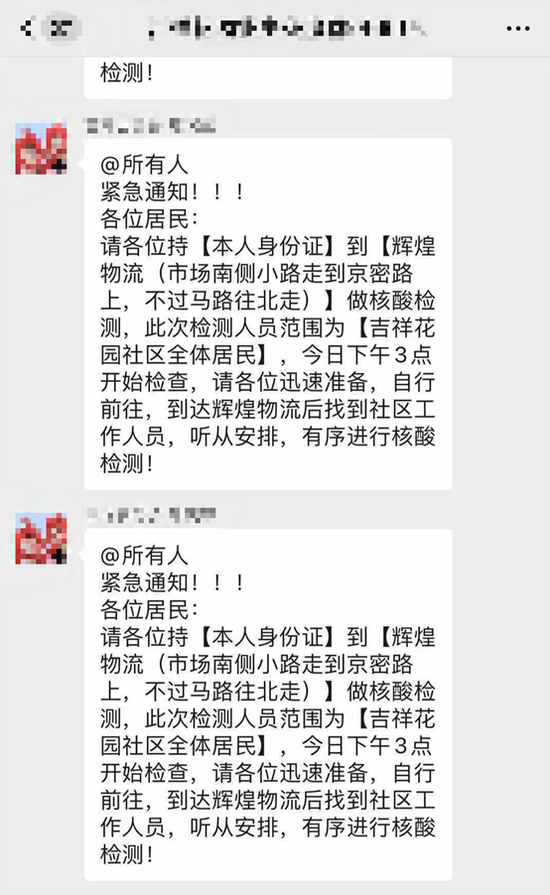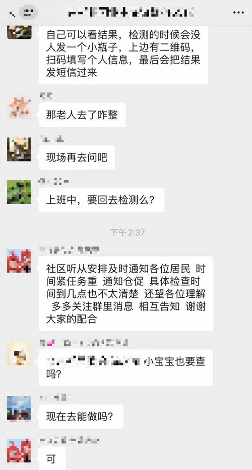 25日下午,手机消息又开始响个不停。14:25分,居委会工作人员在群里连发三条紧急通知,所有社区居民去做核酸检测!