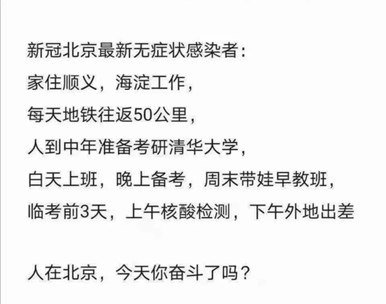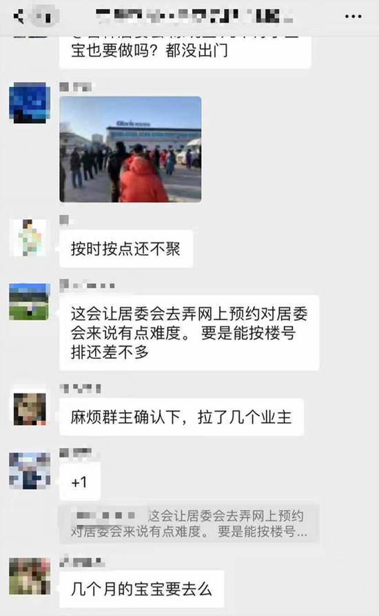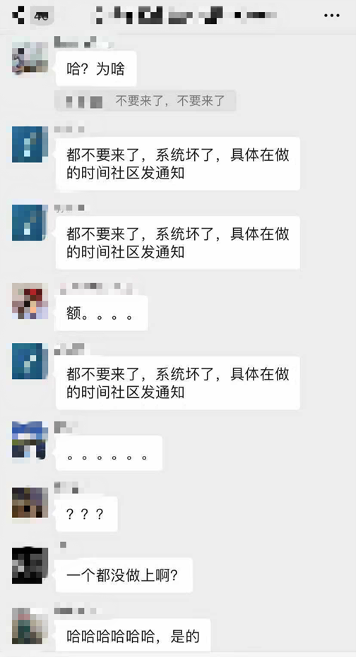 35分钟后就开始大规模筛查,看到消息的业主们又炸了,这个点钟大家都还在公司搬砖,检测地点在哪儿?行动不便的老人、孕妇怎么过去?幼年孩子用做吗?这么多人聚集风险不更高吗?一堆问题瞬间刷屏,业主群也瞬间满了,大家互相转告,在群里发问,有的人直接从望京打车往回走,手头的工作是没法好好继续了……