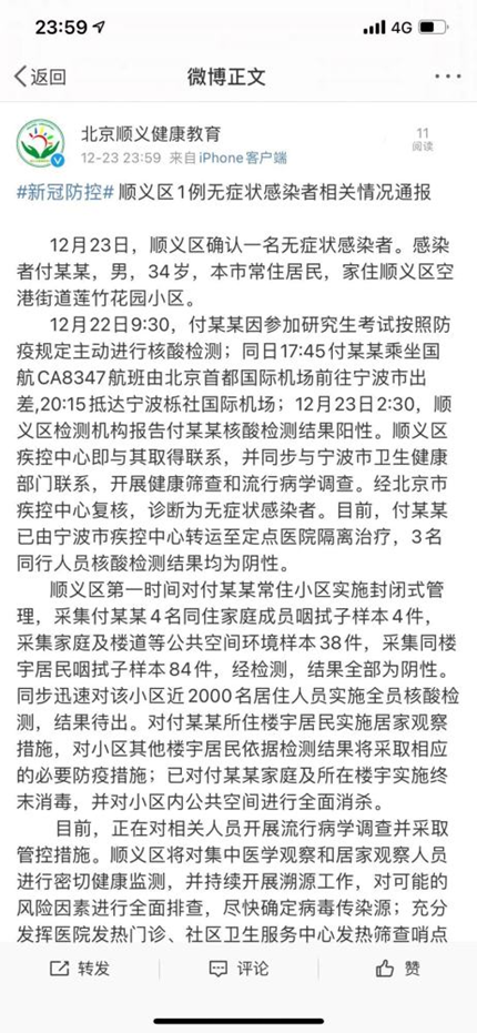 “北京顺义健康教育”官方微博12月23日深夜发布,北京顺义区确认一名无症状感染者。感染者付某某,男,34岁,北京市常住居民,家住顺义区空港街道莲竹花园小区。