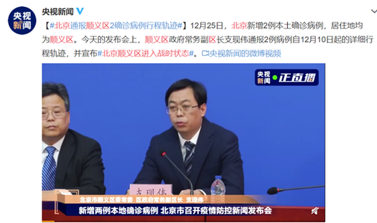 12月25日,央视新闻报道,北京新增2例本土确诊病例,居住地均为顺义区。顺义区政府常务副区长支现伟宣布北京顺义区进入战时状态。