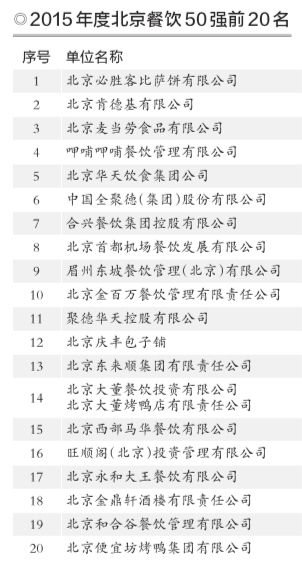 榜单显示,北京餐饮企业50强的前三名均为洋品牌所占,分别是北京必胜客比萨饼有限公司、北京肯德基有限公司、北京麦当劳食品有限公司。随后是呷哺呷哺和北京华天饮食集团,全聚徳股份则位居第六位。另外,“2015年度北京餐饮十大品牌”也同时公布,包括便宜坊、必胜客、东来顺、护国寺小吃等企业登榜。