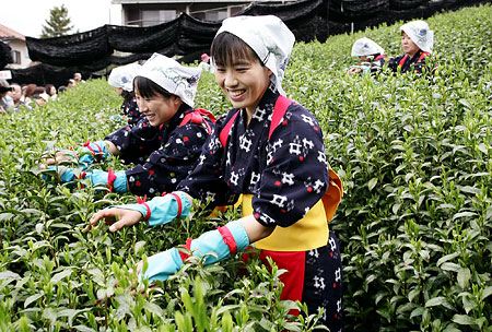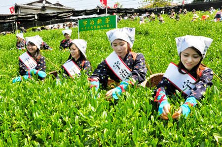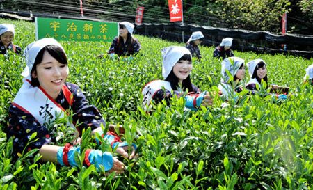 据日媒报道,近日,“宇治茶”产地、日本京都府宇治市举行了“八十八夜茶采摘集会”。身着藏青和服、绑着束袖带的宇治茶女们灵巧地采摘了水嫩的新茶。宇治茶是日本的高级茶品。