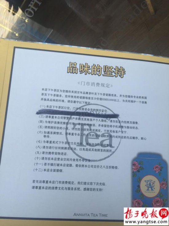 这名工作人员随后翻开菜单,只见首页上有一条本店消费须知,其中一条即是客人不小心打破瓷器需按照销售价格的85折进行赔偿。“这样的规定也是‘安薇塔英国茶屋’所有门店的统一规定。”工人员介绍,魏女士一行5人当天使用的瓷器含一壶、一杯、一碟,杯子打碎了,当时魏女士也接受的赔偿金额,并且付款,他们就将另外部分打包,让魏女士带走。